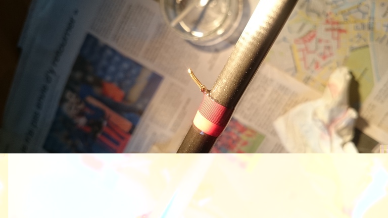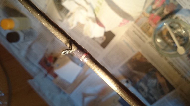 J'ai passé une deuxième couche de vernis ce matin sur l’autocollant (il n'y en avait pas assez) et sur les deux premiers anneaux (le vernis était juste affleurant sur la ligature donc j'ai préféré en remettre). Vous verrez que ya des petites bulles (je suis encore novice dans le rodbuilding