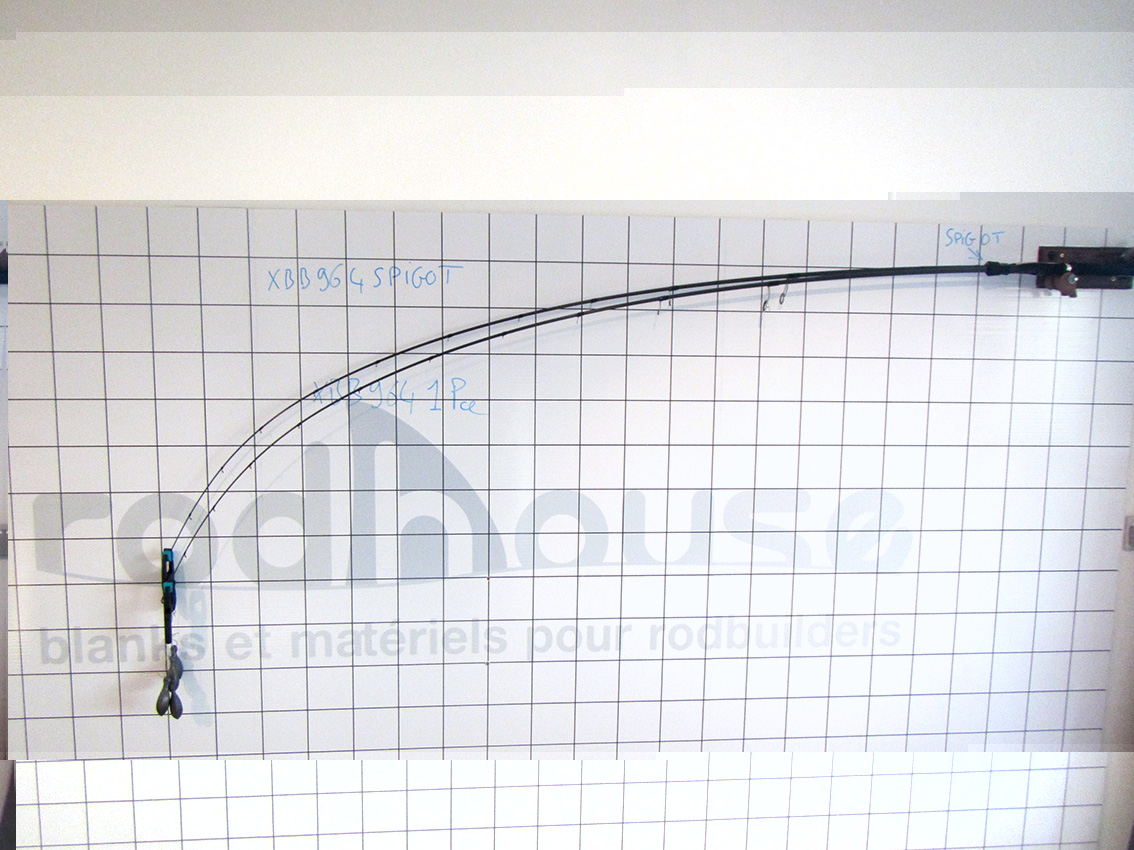 en dessous l'XBB 964 de bibi, spigotée pile poil en sortie de talon, là ou ça ne peut pas être moins impactant sur l'action de le blank, et la XBB 964 de fret', dans sa configuration d'origine en monobrin, en charge à 228 grs puis 456 grs.