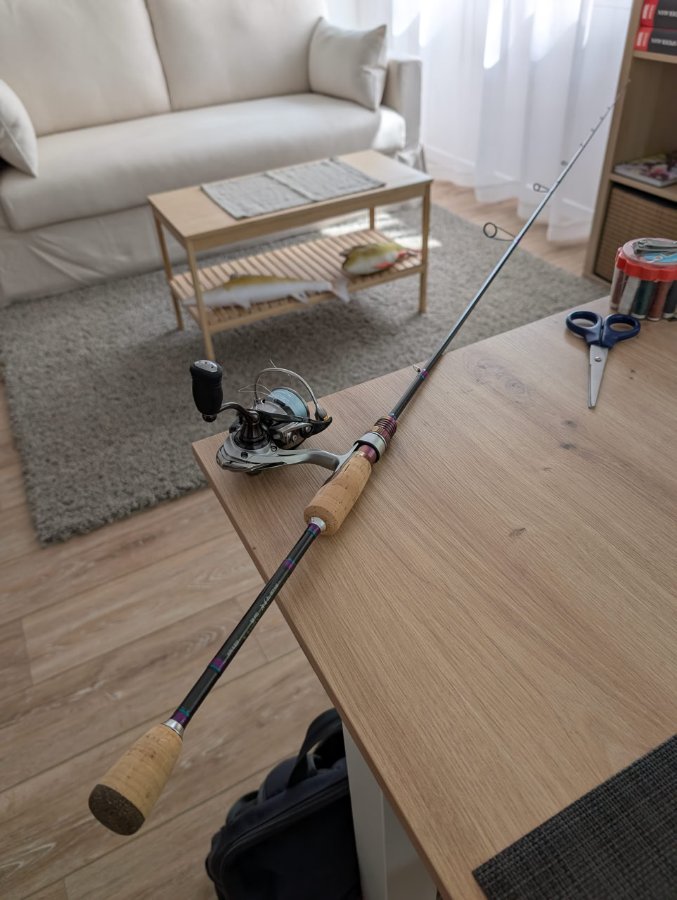 Canne destinée aux petits carnassiers aux leurres souples UL (TP 2.5 g max, LS 2'' max). Pas pesé la bestiole mais c'est très léger. L'ensemble est très bien équilibré par mon Caldia pour des animations canne haute. Ça envoie de la crotte de nez sans souci (tresse en PE 0.2 + fluoro en 16/100). Le scion plein est un atout sensation quand on gratte le fond. Les touches sont clairement perçues. La canne n'est pas du tout nouille et permet de combattre des perches de 30-35 sans souci. Il faut quand même une épuisette pour soulever de tels poissons.