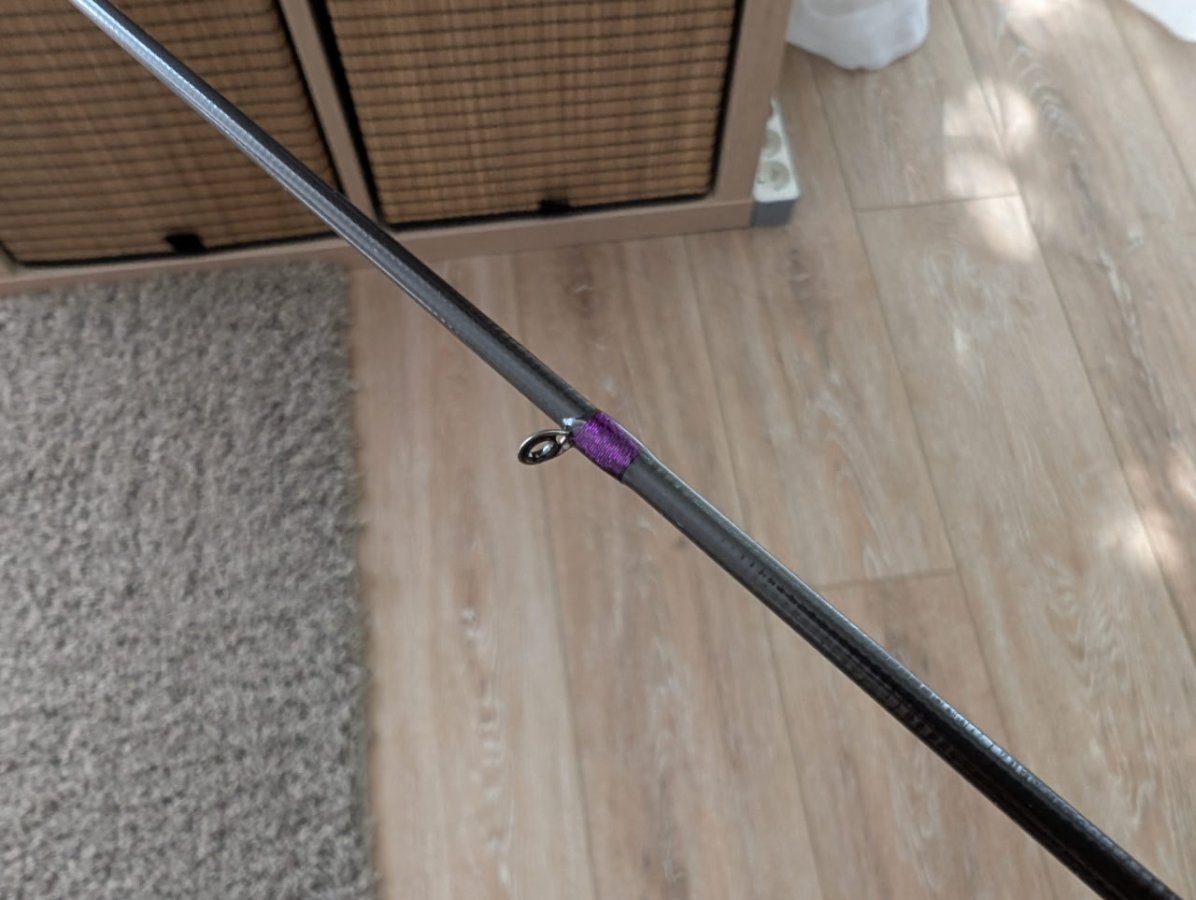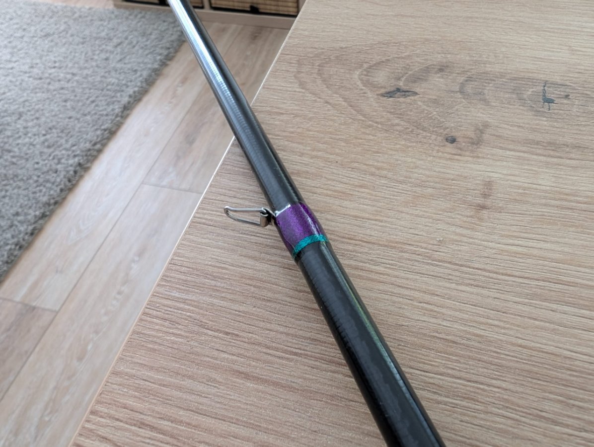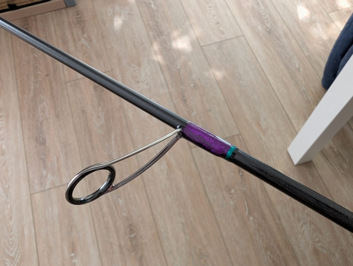 Seul hic : j'aurais dû faire un sous-vernis long avant de poser le sticker... Malgré le vernis d'origine du blank, les spires de carbone sont très légèrement affleurantes côté butt. Vous le saurez !