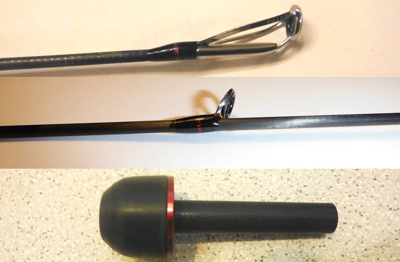 Vue d'ensemble et signature imprimée : La poignée en mode long, vue d'ensemble des couleurs de liserés choisies : Détail sur les plus petites ligatures, et le talon court vissé dans l'insert maison avant collage : La répart a été validée .. au chatterton, du vrai de vrai, des petites lamelles coupées et pas de souci, j'ai pu fixer les anneaux et appuyer les lancers. Lors des tests avec 15 et 30g, c'est bluffant, au moins aussi bien que ma IeauDa de 2014, et mieux sur les 15g.