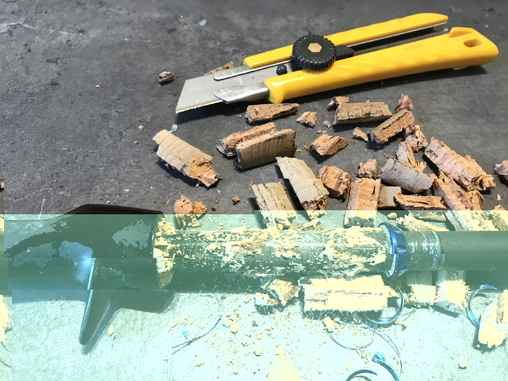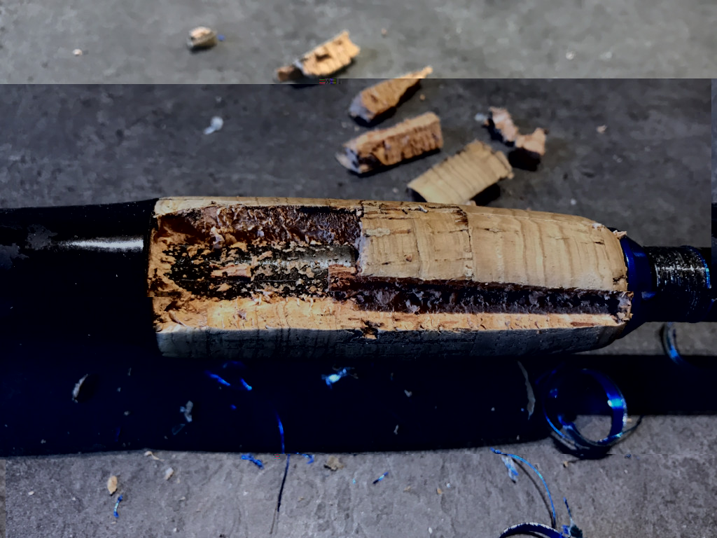 Le SJ-706 je l'ai depuis longtemps, c'était mon premier montage, vernis ballon de rugby, KT noyés dans la surdose d'Epoxy et liège un peu passé... allez hop, remontage avec poignée carbone pleine !