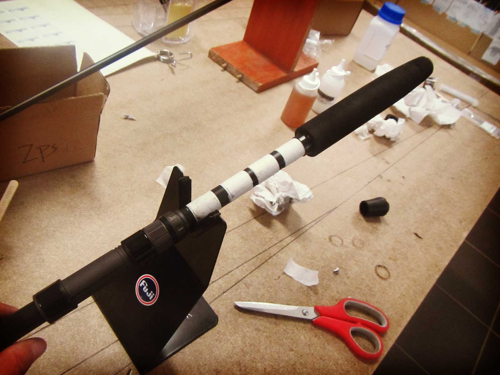 Centrage et assise du Porte Moulinet en effectuant des tours de scotch sur le blank, sur un tube de blank en 1+1 on ne peut pas utiliser de shim puisque le tube n'est pas conique