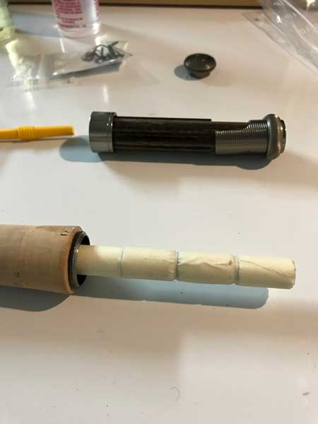 Sur une petite canne comme ça, ça ne sera pas gênant mais pour les prochaines, quand tu colleras le PM sur du scotch, il faudra que tu fasses attention à laisser le blank apparent entre les enroulement de scotch et que tu bourres de colle à ces endroits là. Sinon, le collage est moins résistant dans le temps