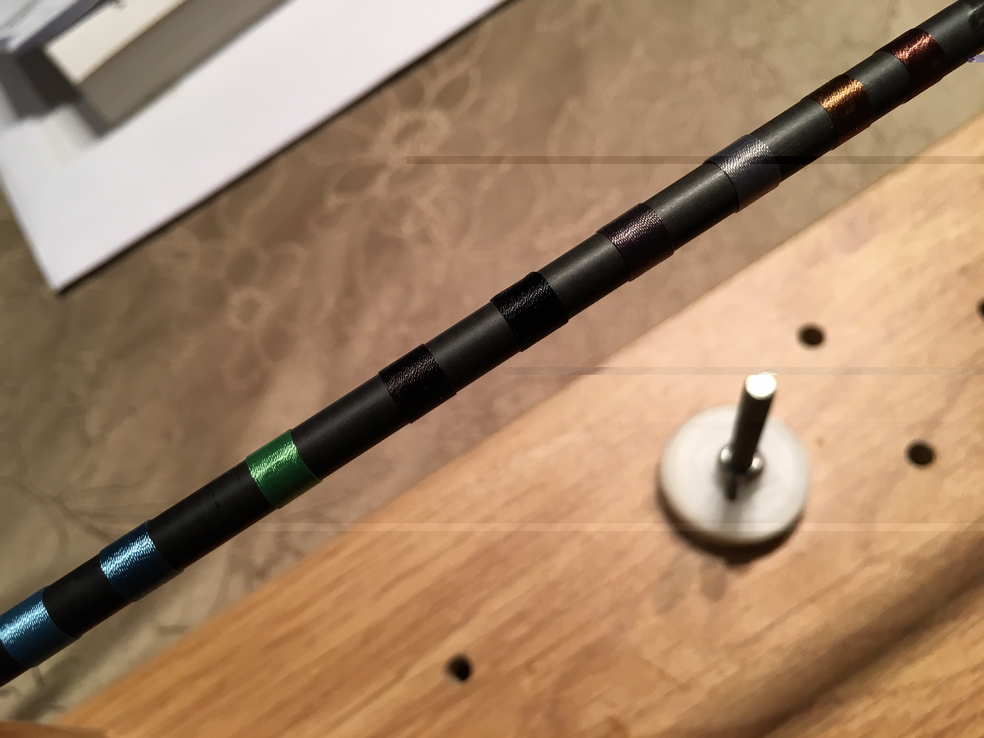 On prend un brin de carbone de couleur semblable au blank et c'est parti pour quelques ligatures :